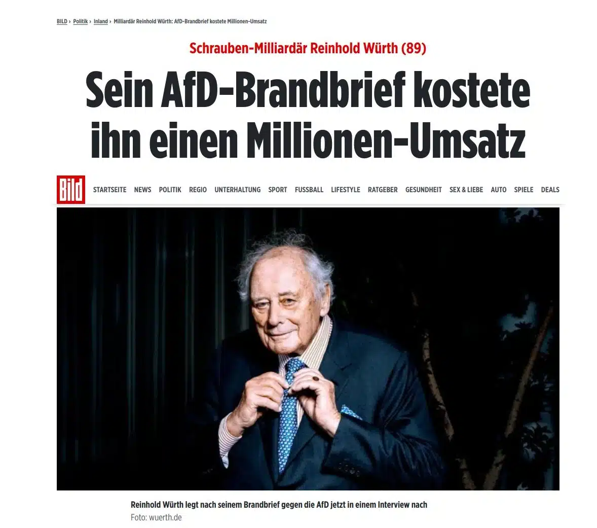 "Seine Haltung kommt ihn teuer zu stehen – doch das nimmt Reinhold Würth (89) in Kauf. Im März hatte der Schrauben-Milliardär einen fünfseitigen Brandbrief an Zehntausende Mitarbeiter geschrieben und sie vor der AfD gewarnt: Er schließe sich dem „Protestzug“ gegen die von der AfD gewünschten „grundsätzliche Veränderung“ voll an, schrieb Würth. Ein Statement, das ihm nach eigener Aussage viel Schulterklopfen, aber dem Unternehmen auch Umsatzverluste eingebracht hat."