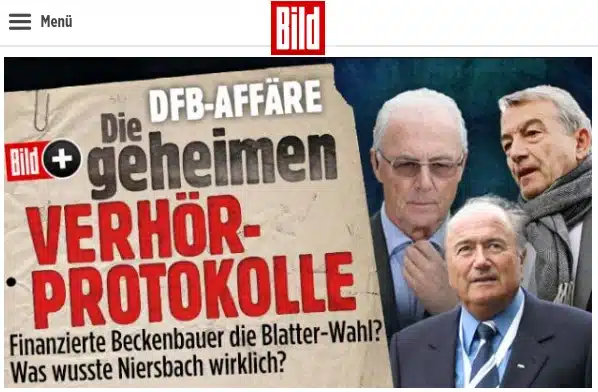 15.12.2015 Nach dem man den „Saubermann“ Beckenbauer bislang von jedem Verdacht freigesprochen hat, geriet er plötzlich in den Fokus der DFB-Affäre. Grund genug für ihn seine Logenbrüder um Hilfe zu rufen. „Die Frankfurter Kanzlei „Freshfields“ vernimmt seit Wochen – im Auftrag des DFB – die ehemaligen Macher der WM 2006. Franz Beckenbauer (70) sagte bereits zweimal aus.“ Quelle: Bild.de (das Foto wird im Artikel nicht verwendet, war aber am 15.12.2015 auf der Startseite von Bild.de zu sehen)