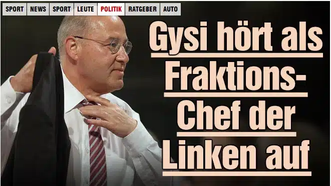 Die wahren Beweggründe für Gysi`s Rücktritt als Fraktions-Chef der Linken mögen nur wenige kennen. Interessant ist in diesem Zusammenhang das Foto, das bild.de am 07.06.2015 veröffentlichte. Allen Anschein nach hat Gysi „Probleme“ und sieht sich deshalb gezwungen seinen Posten zu räumen. Auf jeden Fall ruft er seine Logenbrüder mit dem doppelten Freimaurersymbol (Krawattengriff und das mit der linken Hand angedeutete M [Mason = Freimaurer]) um Hilfe, Quelle: bild.de (das Foto wird im Artikel nicht verwendet, war aber am 07.06.2015 auf der Startseite von Bild.de zu sehen)