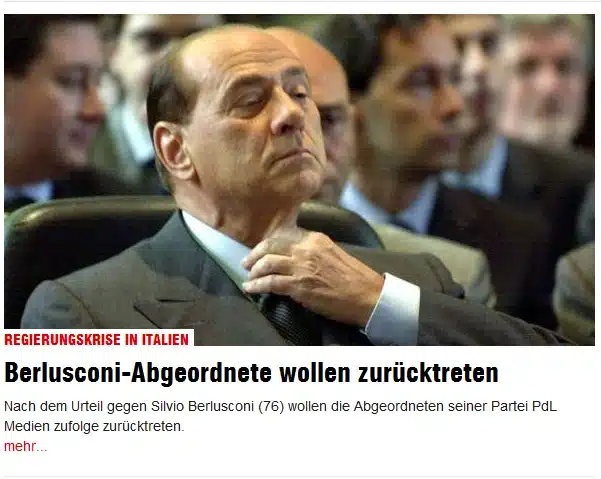 12.08.2013 Italiens bekanntestes Logenmitglied Silvio Berlusconi (P2-Loge) hat nach der Verurteilung, am 1. August 2013, wegen Steuerbetrugs den Rückhalt in seiner Partei PdL (Partei Volk der Freiheit) verloren. In den Mainstreammedien wird er daraufhin mit dem oben gezeigten Signalfoto mit freimaurerischem Krawattengriff abgebildet. Quelle: Bild.de