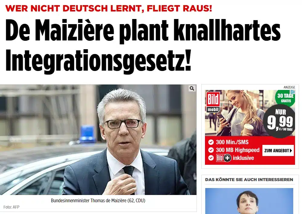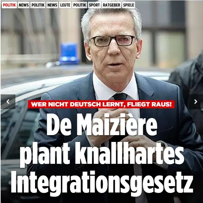 Am 26.03.2016 berichtet bild.de über die (angeblich) geplante „Verschärfung“ des Integrationsgesetzes und zeigt Thomas de Maizière mit freimaurerischem Krawattengriff. „Bundesinnenminister Thomas de Maizière will knallhart durchgreifen! Ein Gesetz soll künftig den Verbleib von Flüchtlingen in Deutschland an deren Bereitschaft knüpfen, sich zu integrieren.“ Warum hier ausgerechnet dieses Bild von de Maizière gewählt wurde, wird aus dem Artikel nicht ersichtlich. Es kann hier nur vermutet werden, dass de Maiziere anderweitig in Schwierigkeiten steckt und Hilfe benötigt. Das Signalfoto wurde sowohl auf der Hauptseite als auch im Artikel verwendet, was auf eine besondere Dringlichkeit der Aussage hinweist.