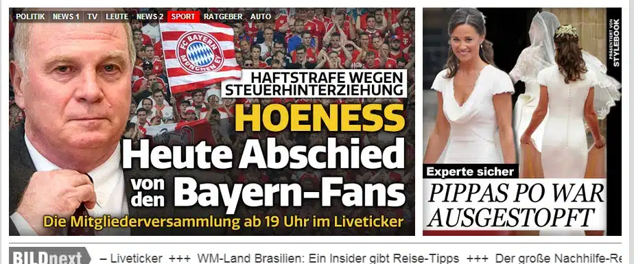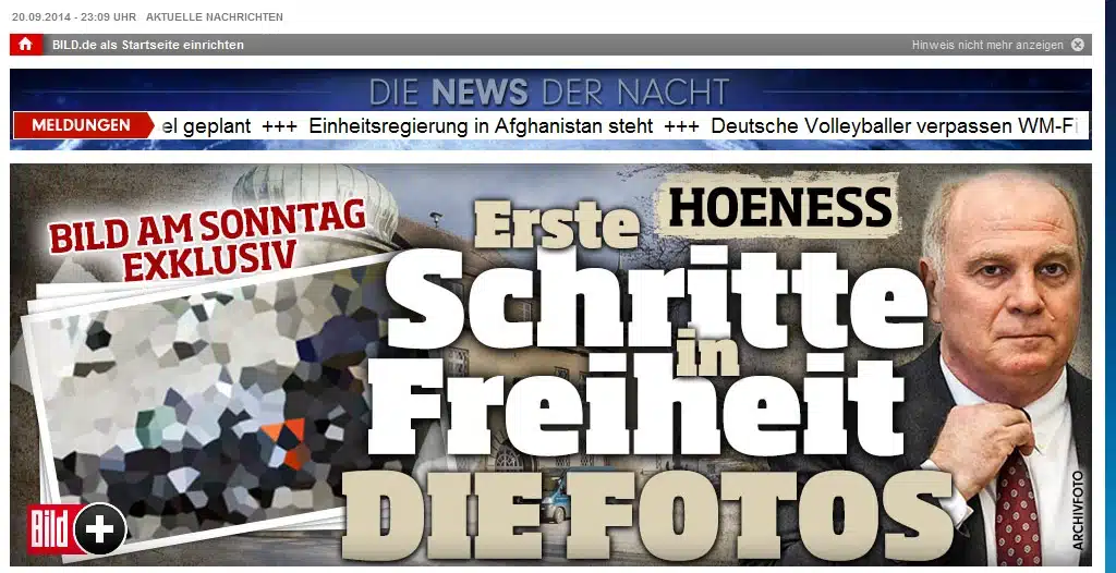 21.09.2014 Einen Tag später berichtet bild.de erneut über Hoeneß Freilassung, dieses Mal aber mit einer leicht geänderten Aufmachung im Vergleich zum Vortag. Quelle: bild.de (der Artikel ist nicht mehr verfügbar!)