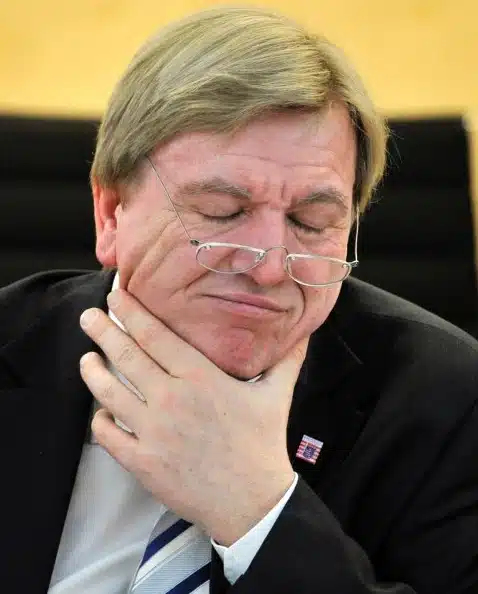 „Wie spricht man angemessen über das Flüchtlingsdrama im Mittelmeer? Der Kieler Regierungschef Albig nennt seinen Kollegen Bouffier als schlechtes Beispiel. Der will das nicht auf sich sitzen lassen.[…] Bouffier habe gesagt, die Preise von Schleppern explodierten, wenn die Chancen der Flüchtlinge stiegen. „Das ist zynisch“, sagte Albig. „Natürlich gibt es diese Logik. Aber zu Ende gedacht, hieße das doch: Man müsste nur dafür sorgen, dass die Boote untergehen, die Menschen ersaufen und das wäre dann ein erfolgreicher Schlag gegen das internationale Schlepperwesen!“ Dies sei eindeutig nicht Bouffiers Denkweise, sagte sein Sprecher in Wiesbaden“ Trotz der Rückendeckung seines Pressesprechers wurde Bouffier am 21.06.2015 in einigen Zeitungen mit dem freimaurerischen Halsgriff abgebildet (genau wie Thomas Middelhoff auf den Bildern weiter unten wählt auch Bouffier den Halsgriff, trotz das er zum Zeitpunkt der Aufnahme eine Krawatte trägt). Zusäatzlich hat er die Brille weit nach vorne auf die Nase geschoben, was als freimaurerischer Brillenblick gewertwt werden kann. Das diese Positionierung der Brille für einen Brillenträger keinerlei Nutzen stiftet, sollte klar sein! Rothkranz schreibt bzgl. des Brillenblicks folgendes: „Auch dem Brillenblick kommt keine festgelegte Bedeutung außer derjenigen zu, daß Personen, die sich damit photographieren lassen, zur Zahl der – mehr oder weniger – „Wissenden“ gehören. Spezielle Botschaften müssen den „Brüdern“ ggf. durch präzisierende Textzusätze zum Singal-Photo „ausgerichtet“ werden. Quellen: Johannes Rothkranz, Freimaurersignale in der Presse – Wie man sie erkennt und was sie bedeuten, S. 20, Pro Fide Catholica, 1996; welt.de (das hier abgebildete Signalfoto stammt vermutlich von bild.de, war aber zum Zeitpunkt der Erstellung dieses Beitrags nicht mehr abrufbar)