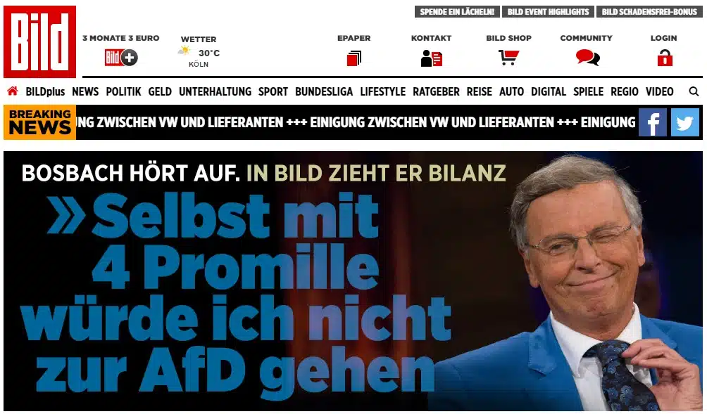 Auf der Startseite von bild.de sehen wir Wolfgang Bosbach, der laut BILD: "der letzte wirkliche Querkopf der CDU. Talkshow-König. Kult-Politiker." ist, mit freimaurerischem Krawattengriff. Im Artikel findet sich ein weiteres Signalfoto, auf dem er mit der Hand die 666 andeutet.
