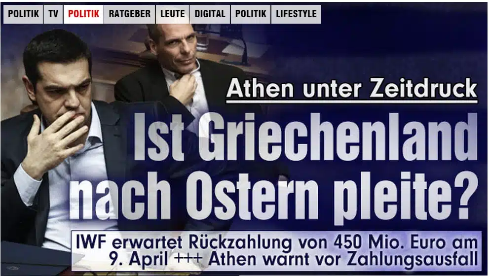 Nur kurze Zeit vor seinem offiziellen Rücktritt als Finanzminister zeigte bild.de Yanis Varoufakis mit freimaurerischem Krawattengriff auf der Startseite. Es muss angenommen werden, dass auch Varoufakis ein Logenbruder ist und dass „Die Griechen stimmen gegen den Euro und gegen die EU-Spiel“ reiner Zirkus war. Quelle: bild.de (das Foto wird im Artikel nicht verwendet, war aber am 03.04.2015 auf der Startseite von Bild.de zu sehen)